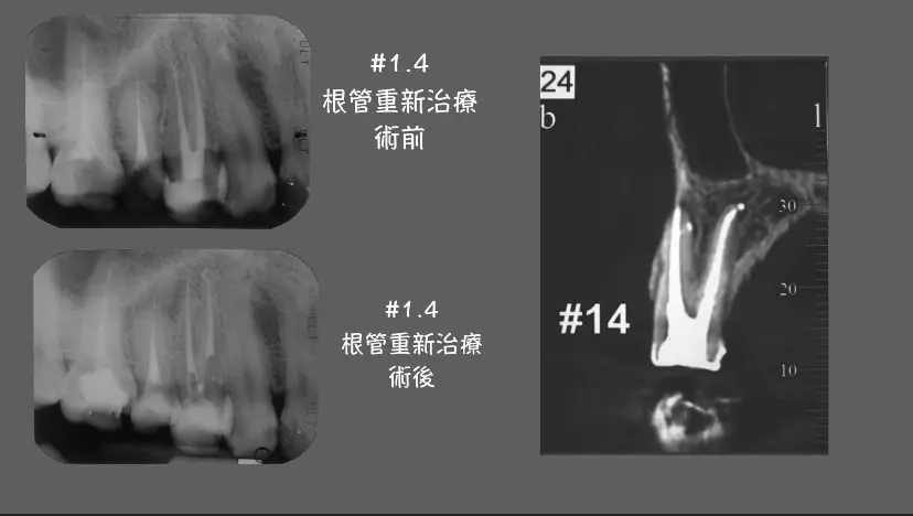 這種治療結果不是天天都看得到,很多時候得要靠運氣以及醫師的經驗。乍看兩張根管治療重新治療前後的X光片,一般患者大概看不出什麼差別,即使是牙醫師有時候也得改變拍攝角度去嘗試自己辛苦努力的成果。